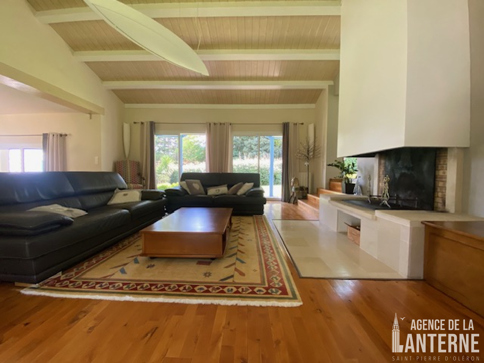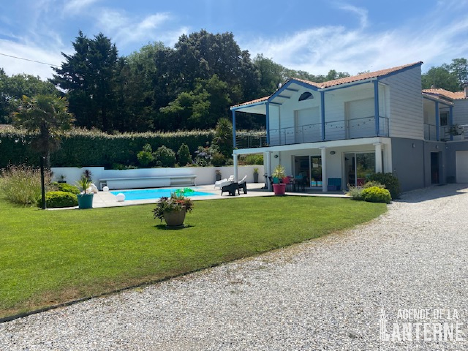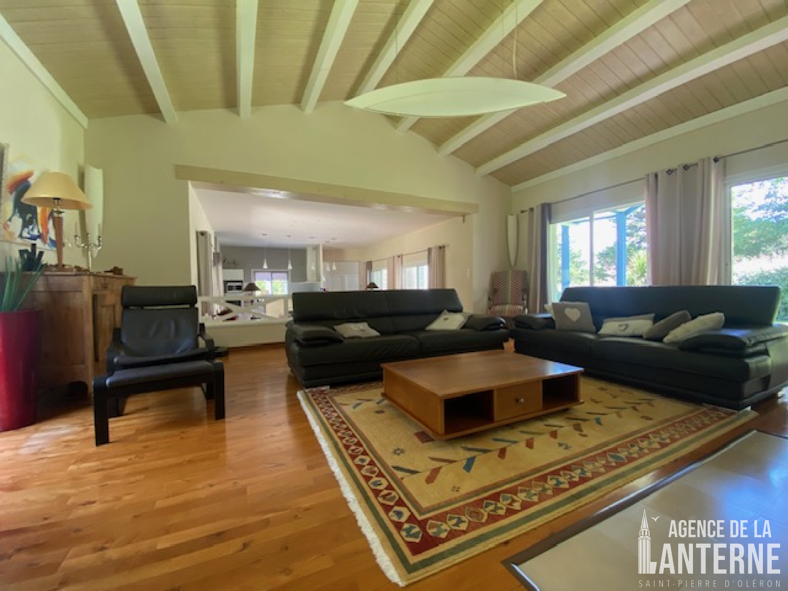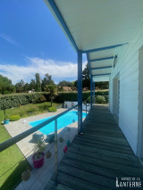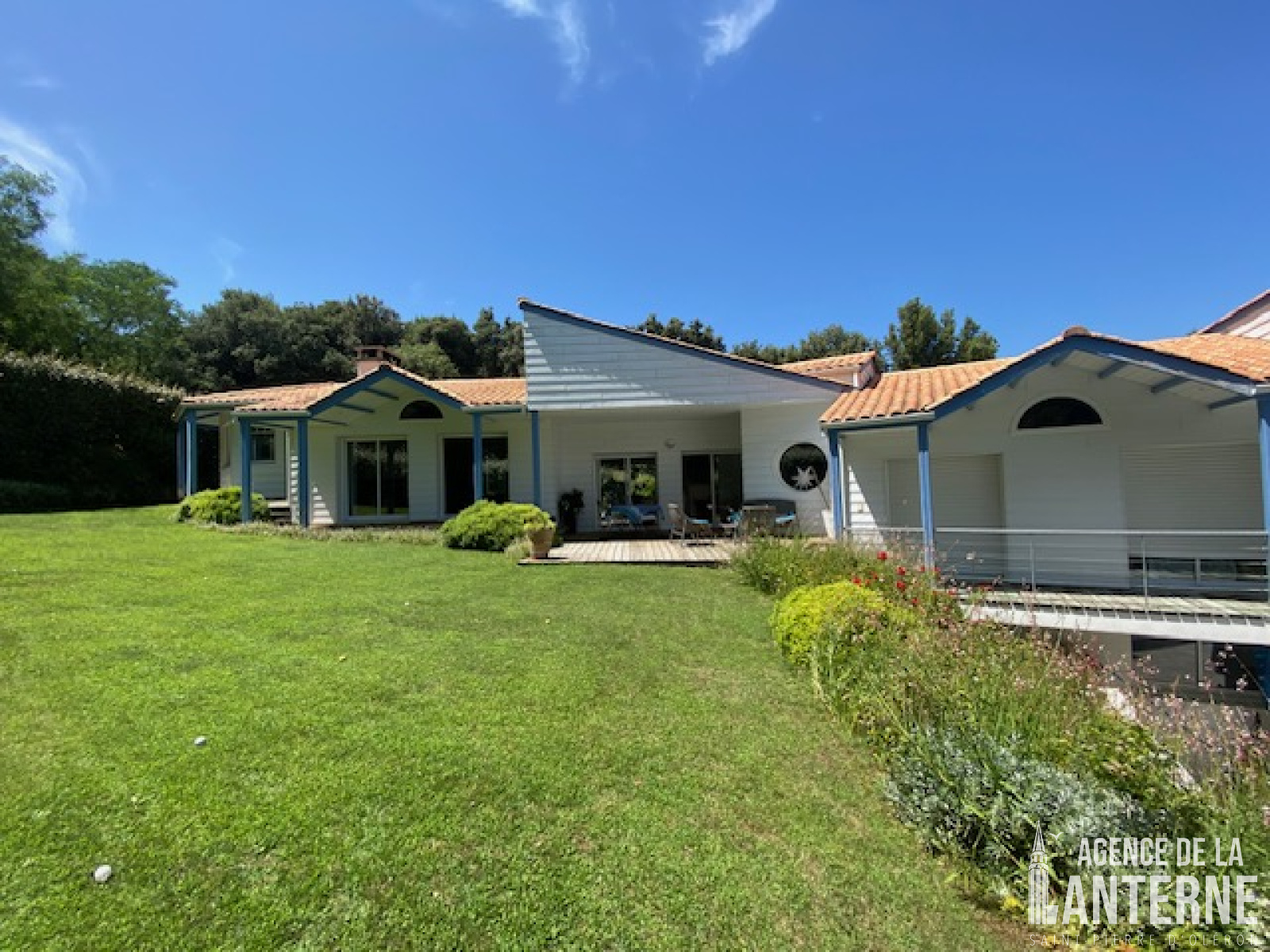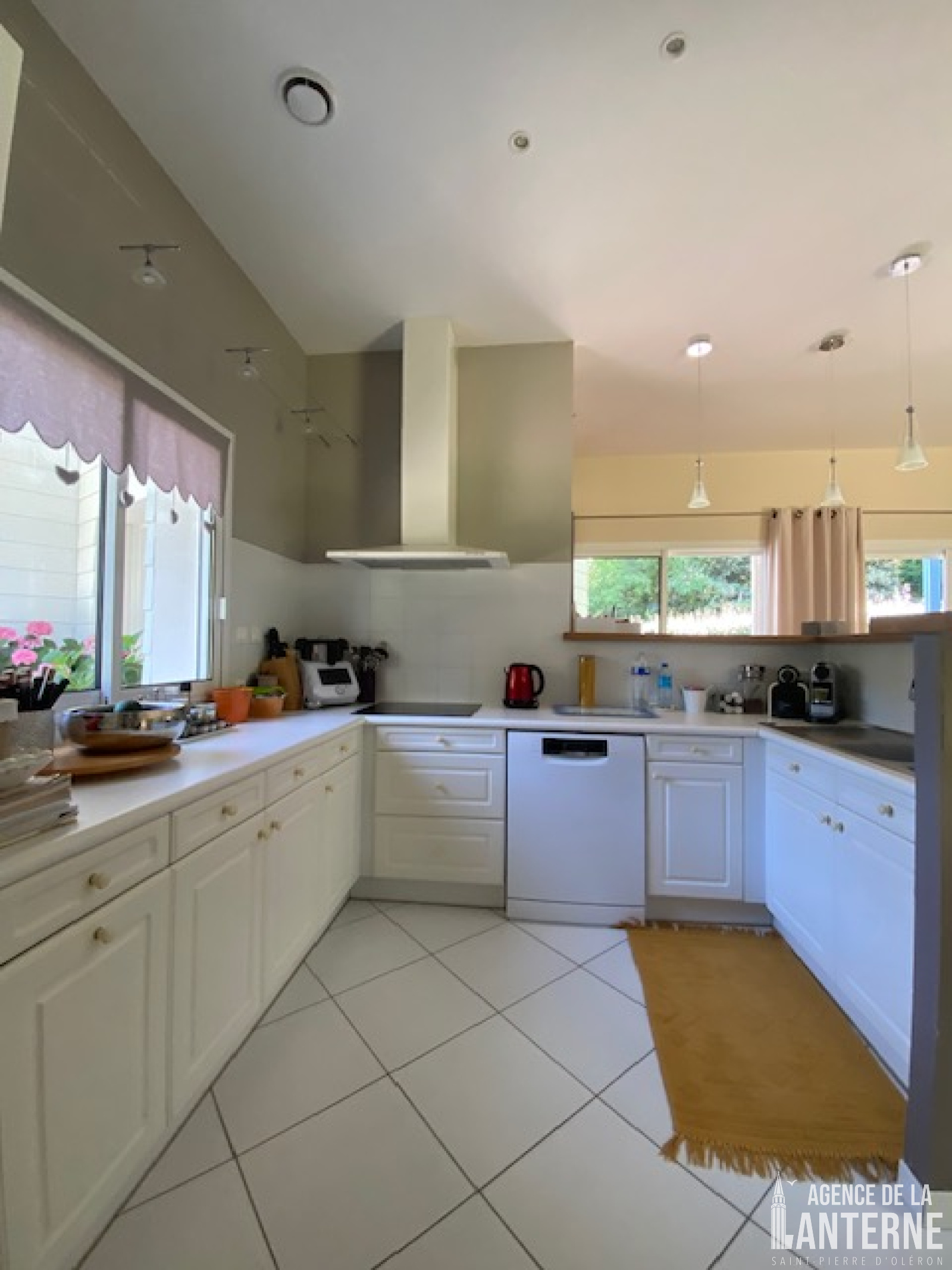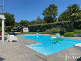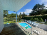 Sur un terrain de 1770 m² entièrement paysagé, maison d'architecte (1996) d'une surface habitable de 235 m² comprenant une entrée, un vaste séjour de 74 m², avec cheminée et cuisine aménagée, prolongé d'un espace bureau de 12 m², une arrière-cuisine de 11 m², quatre chambres (8, 11, 12 et 13 m²), une salle de bain + douche, une salle d'eau, deux WC.