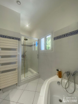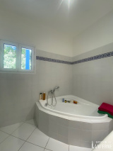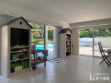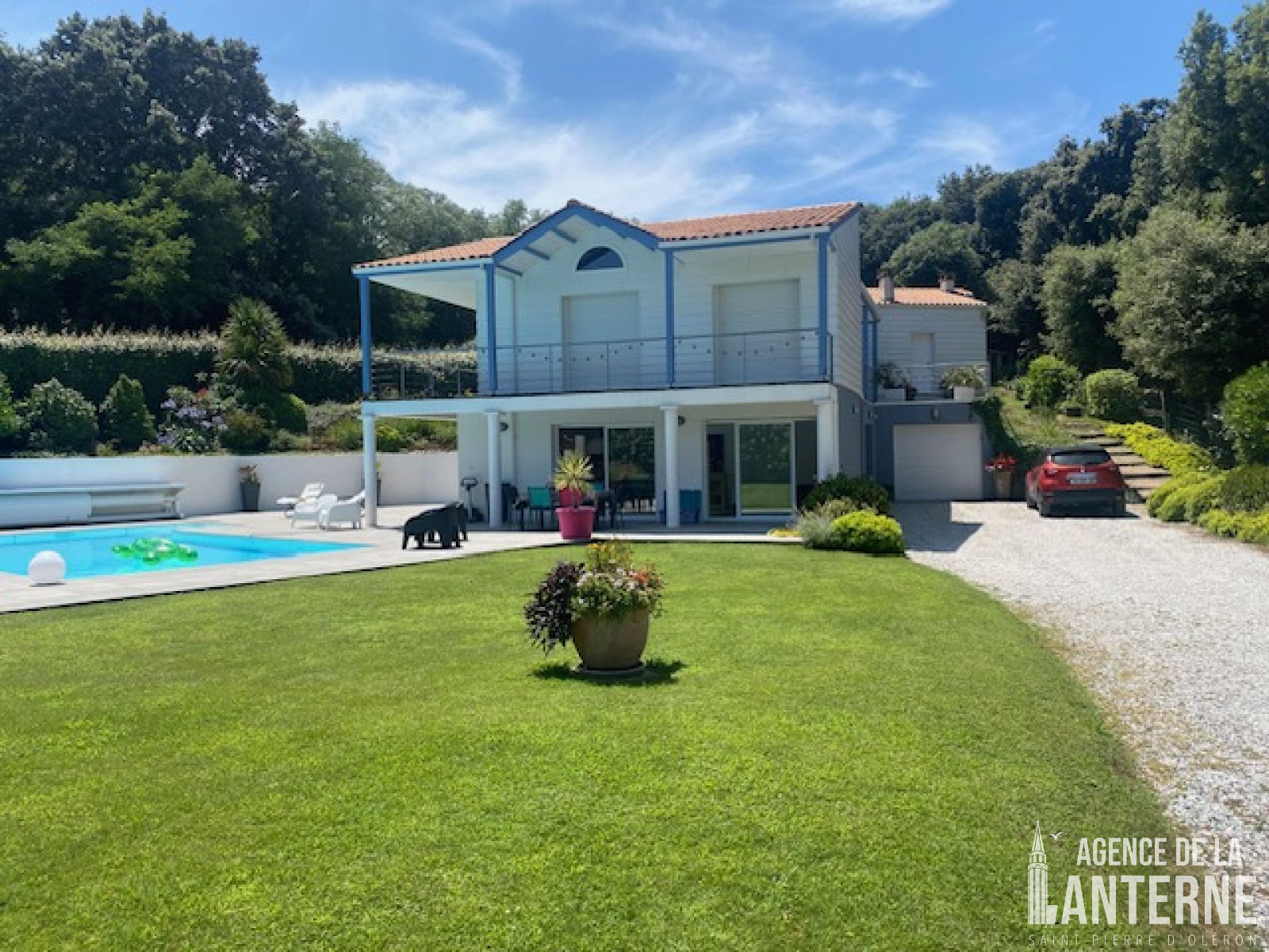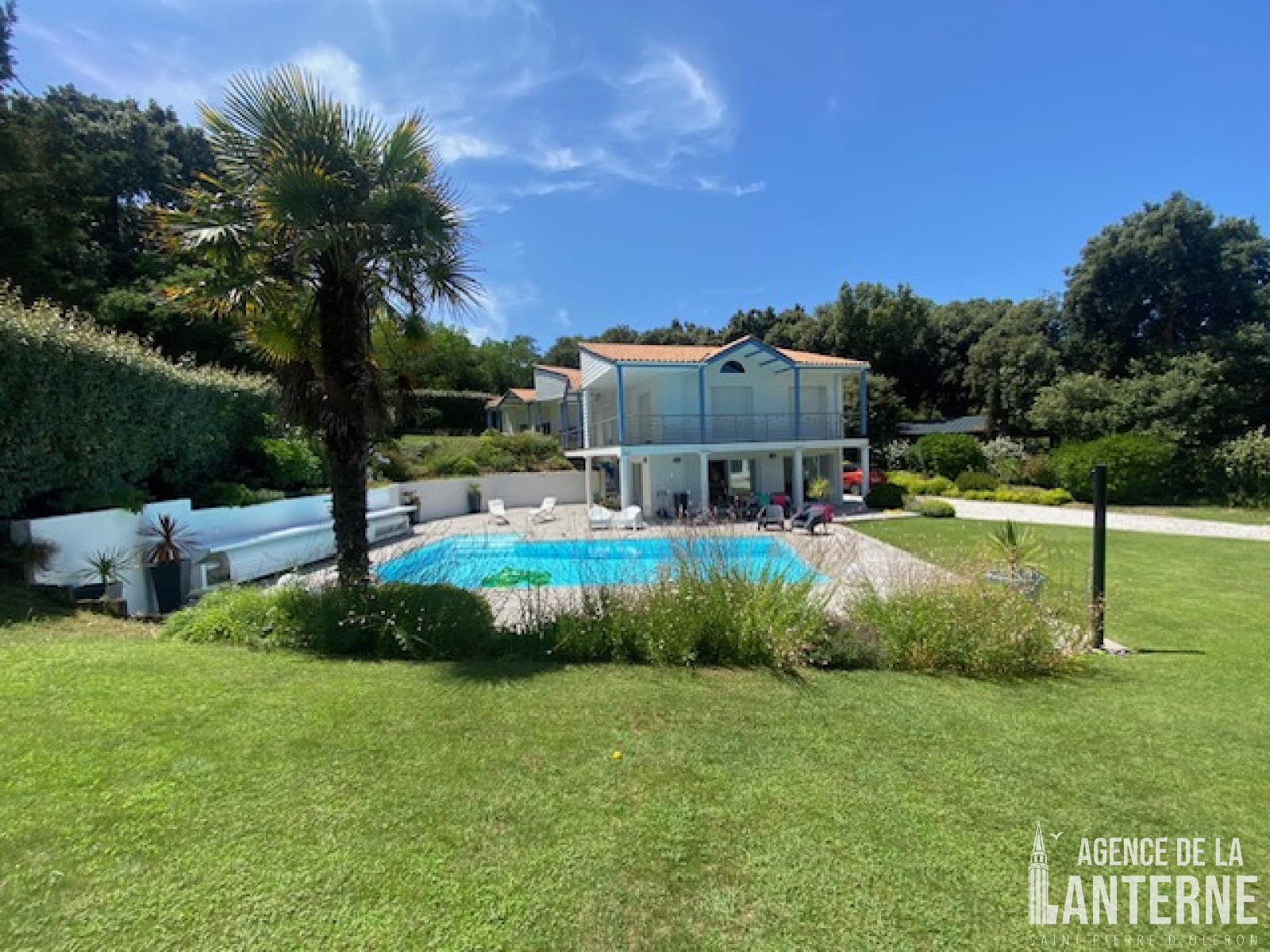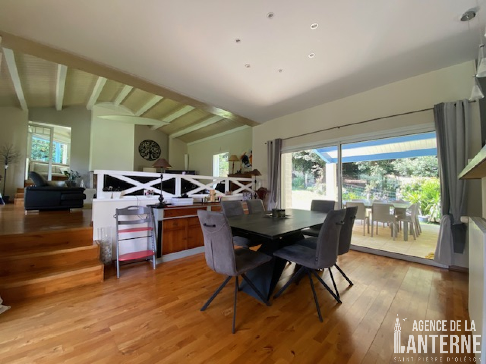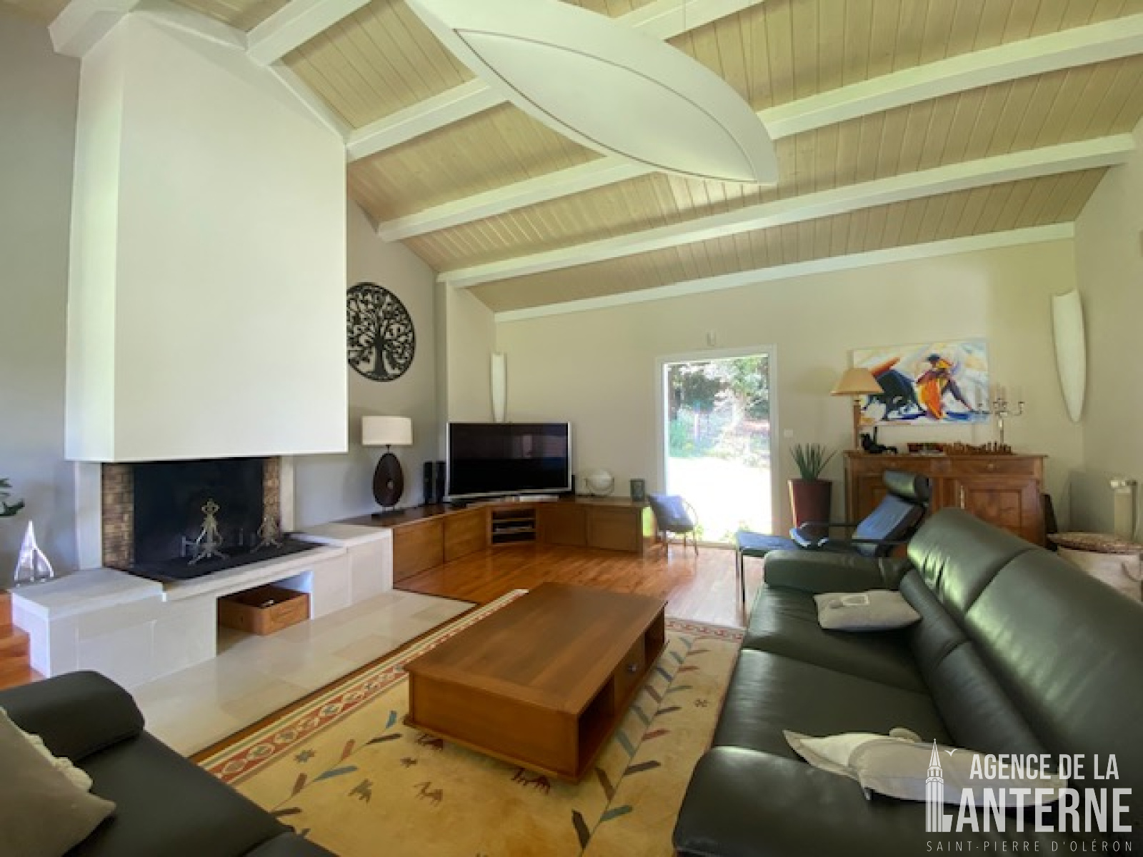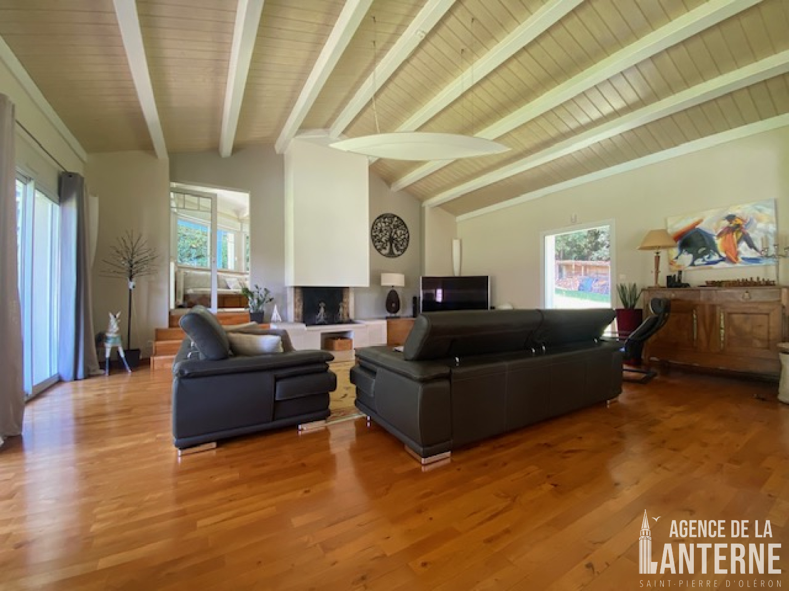 Sur un terrain de 1770 m² entièrement paysagé, maison d'architecte (1996) d'une surface habitable de 235 m² comprenant une entrée, un vaste séjour de 74 m², avec cheminée et cuisine aménagée, prolongé d'un espace bureau de 12 m², une arrière-cuisine de 11 m², quatre chambres (8, 11, 12 et 13 m²), une salle de bain + douche, une salle d'eau, deux WC.