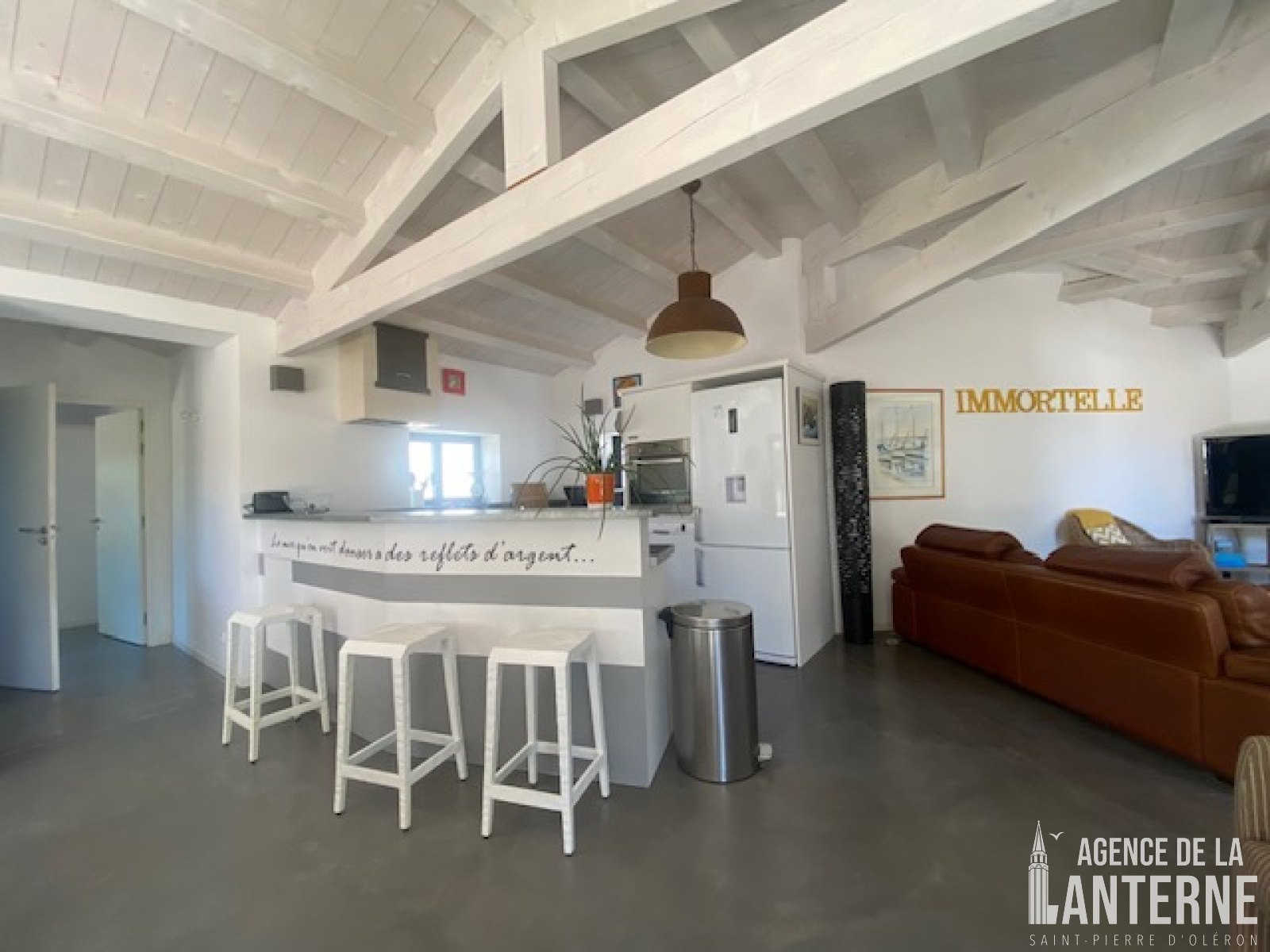 Une belle pièce à vivre de 55 m² avec cuisine ouverte, aménagée et équipée, le tout s'ouvrant sur 27 m² de terrasses avec petite vue mer (selon la saison).